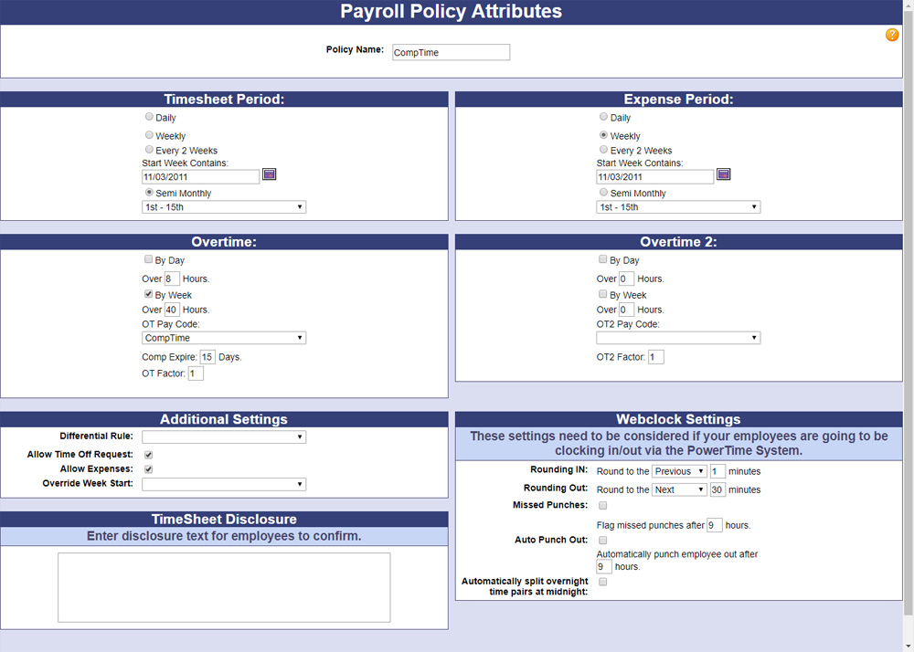 Creating Payroll Policies is a necessary step of configuring your PowerTime system, but it’s not a hard task. Small companies may only need one catch-all policy, while large or complex company structures may enjoy the convenience of many different policies for different types of employees or shifts.